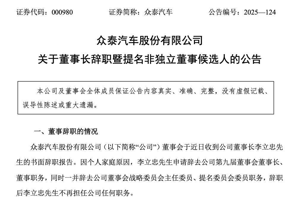 【大河财立方消息】12月29日晚间,众泰汽车(000980.SZ)公告称,公司董事长李立忠因个人家庭原因申请辞去董事长、董事职务,同时辞去董事会战略委员会主任委员、提名委员会委员职务。