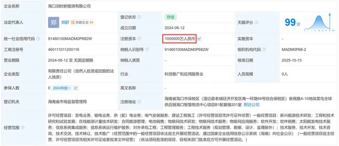 公开资料显示,海口润时新能源有限公司成立于2024年6月12日,此前注册资本241万元,经营范围包含发输配电业务、新兴能源技术研发、在线能源计量技术研发、合同能源管理、电池销售、物联网技术研发应用、以及软件开发销售等。